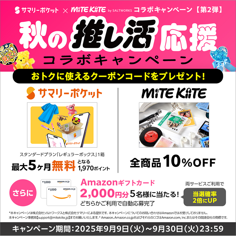 本キャンペーンは、「MiTE KiiTE by SALTWORKS(@Saltworks_inc)」と「サマリーポケット(@SumallyPocket)」の両Xアカウントをフォロー&指定のキャンペーン投稿を2025年7月21日(月)23:59までの間にリポストしている方の中から抽選で、特典「推し活応援セット」を3名様にプレゼントするキャンペーンです。